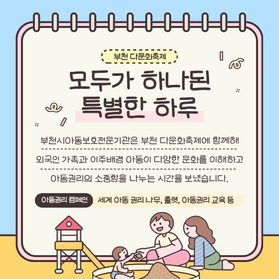 ´Ù¾çÇÑ È°µ¿°ú ±â°ü È«º¸¸¦ ½Ç½ÃÇÏ¿© ¾Æµ¿°ú °¡Á·µéÀÌ ½±°í Àç¹ÌÀÖ°Ô ¾Æµ¿±Ç¸®¸¦ ÀÌÇØÇϰí, ÀÌÁÖ¹è°æ °¡Á¤°ú Áö¿ª»çȸ°¡ ÇÔ²² ¾î¿ï¸®´Â ¶æ±íÀº ½Ã°£À̾ú½À´Ï´Ù!