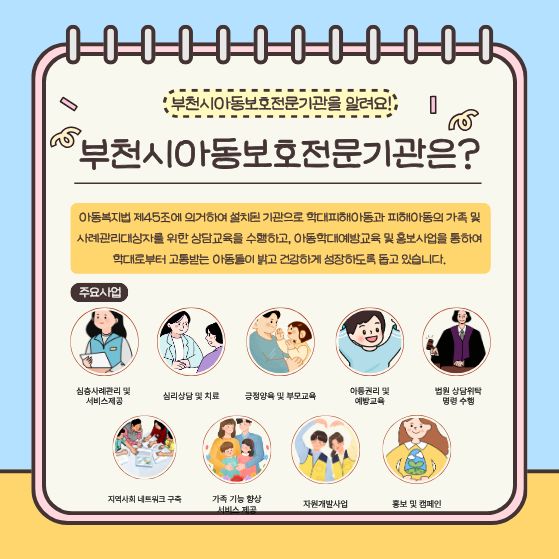 ºÎõ½Ã¾Æµ¿º¸È£Àü¹®±â°üÀº ¾ÕÀ¸·Îµµ ¸ðµç ¾Æµ¿ÀÌ Á¸Áß¹Þ°í ÇູÇÏ°Ô ¼ºÀåÇÒ ¼ö ÀÖµµ·Ï ´Ù¾çÇÑ Ä·ÆäÀΰú ÇÁ·Î±×·¥ ¿î¿µÇϰڽÀ´Ï´Ù~